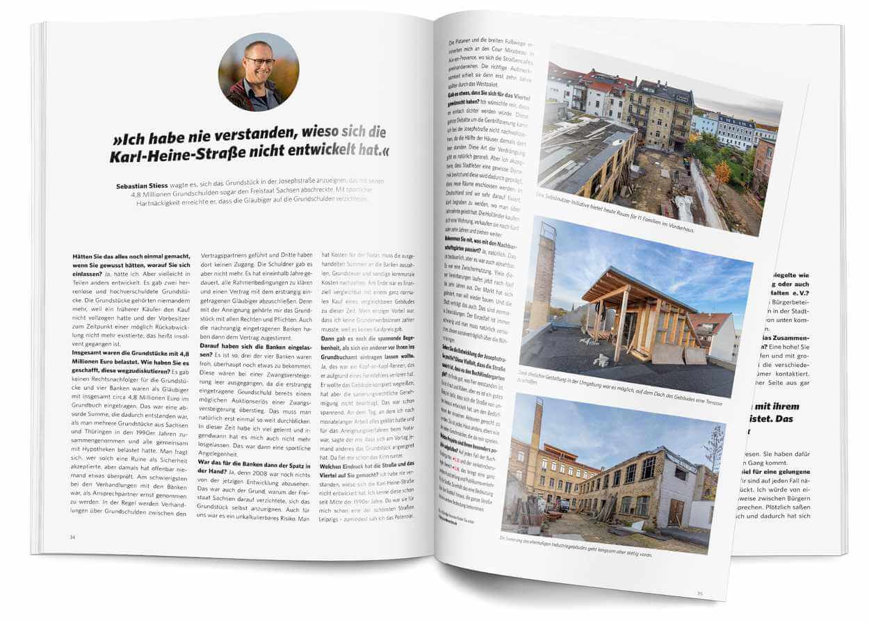 Dieses Gespräch ist Teil einer Dokumentation über die Entwicklung des Bildhauerviertels in Leipzig Lindenau. Die Broschüre enstand in enger Zusammenarbeit mit dem Amt für Stadterneuerung und Wohnungsbauförderung (ASW) und dem Lindenauer Stadtteilverein e.V..